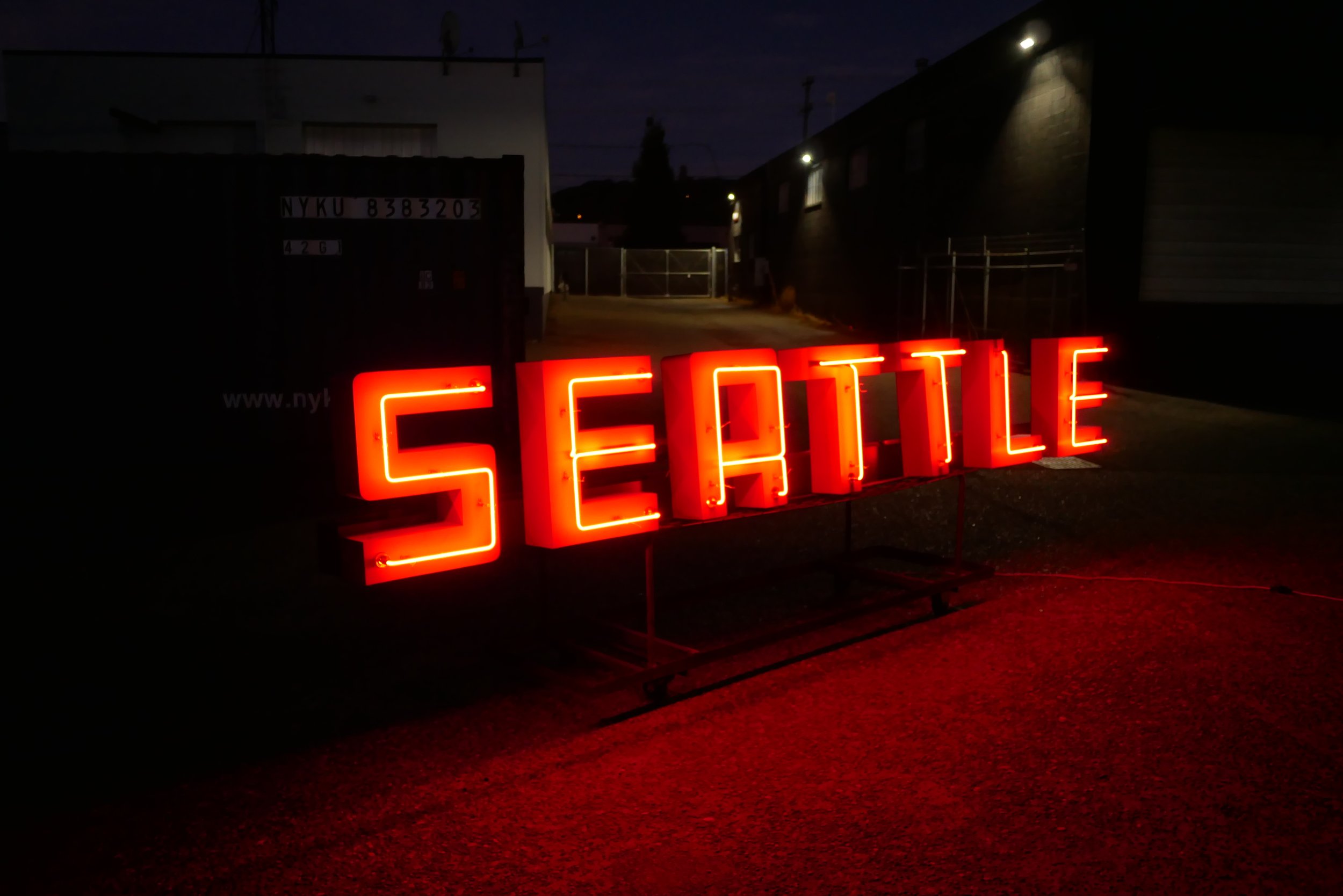 City After Midnight evokes a landmark that never truly existed. The original sign, which once spelled “Lee & Eastes,” stood near the corner of Airport Way and Lander. For decades, its glowing letters silently bore witness to countless late-night walks and bike rides between Georgetown and Seattle.